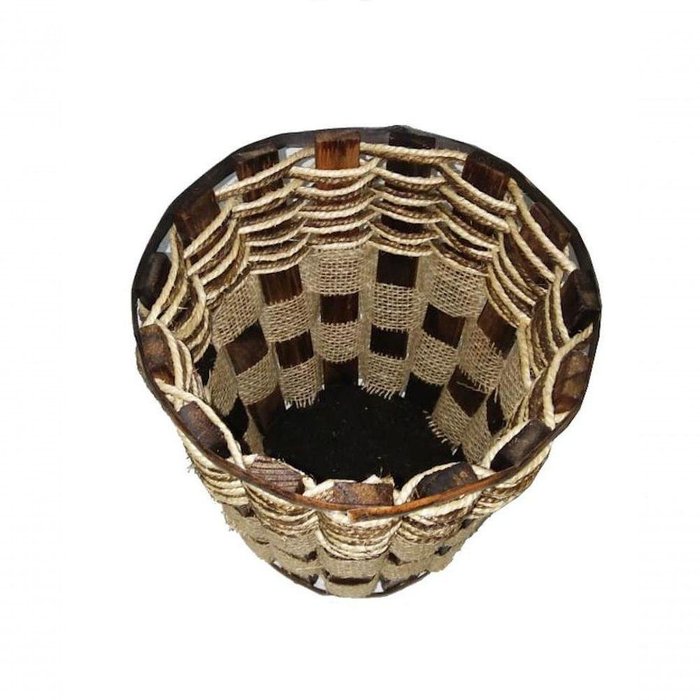 Lindo cachepot de madeira rústico com detalhes em cordas e tecido.