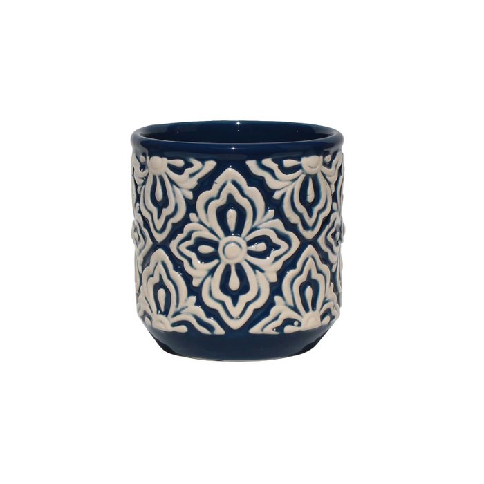 Vaso em Cerâmica Cachepot Para Plantas Azul e Branco com Desenhos em Alto Relevo