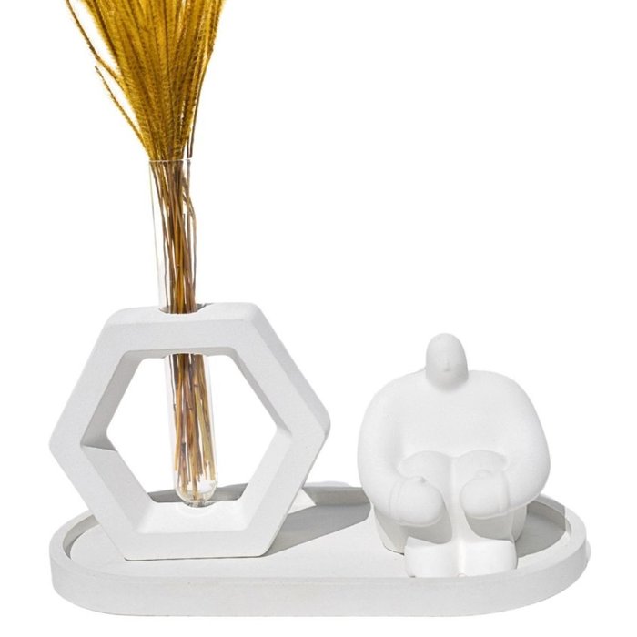 O Conjunto Vaso Decorativo Solitário Hexa, Estátua Gigante e Bandeja Oval G, é perfeito para dar aquele toque especial que falta na decoração da sua casa ou escritório. Todas as peças são elaboradas artesanalmente em cimento, garantindo durabilidade e um toque macio, tornando-a ideal para embelezar mesas, estantes ou prateleiras. Perfeita para quem busca uma peça decorativa que combine impacto visual e profundidade emocional, este conjunto decorativo adiciona um elemento de admiração e encanto ao seu ambiente.
