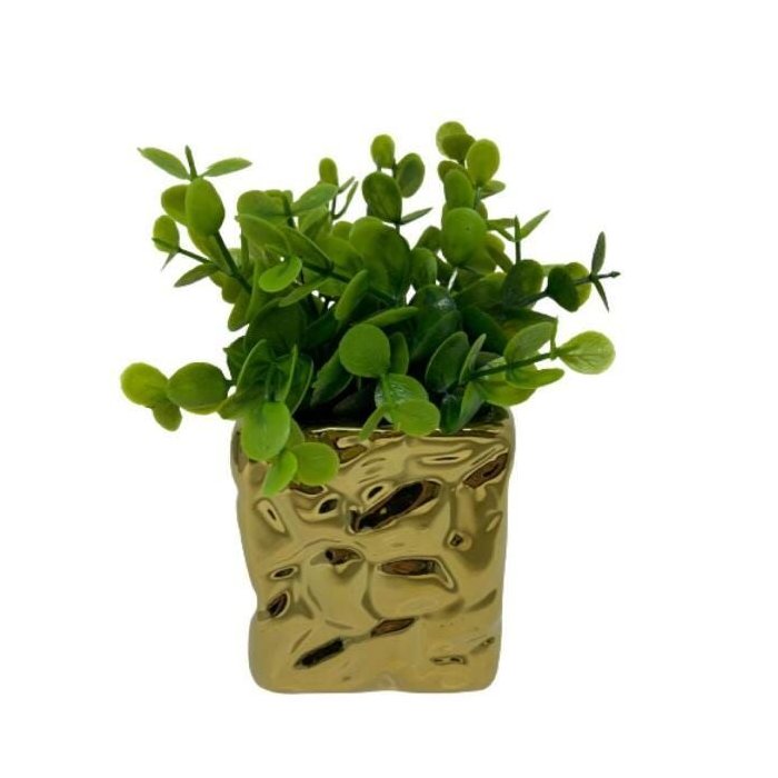 Vaso Decorativo Quadrado de Cerâmica Dourado com Planta