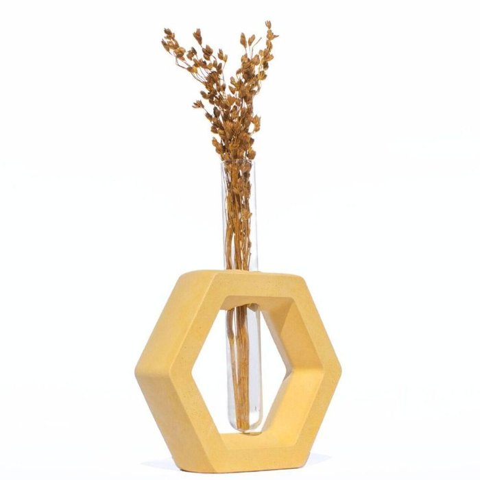 Vaso Decorativo Solitário Hexa 16,5cm Artesanal em Cimento Amarelo