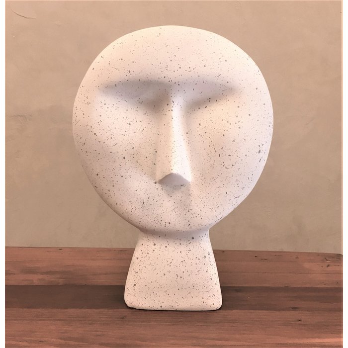 Vaso feito em resina no formato de um rosto quadrado e o outro redondo, na cor branca com efeito de grafite. Peça de traço simples, é inspirado nas estatuais gigantes da Ilha de Páscoa, chamadas Moais, pode ser utilizada em estantes, mesas e aparadores. Criação desenvolvida por Andrés Fernandez e fabricado nacionalmente pela Modali Design.