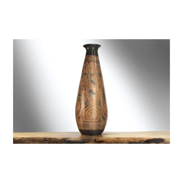 Vaso marrom com detalhes preto e laranja feito em cerâmica queimado em alta temperatura, pintado á mão com desenhos marajoaras. Típicos da região de Belém do Pará, onde a cultura indígena é bem presente e vem sendo cultivada através da cerâmica marajoara. Feito na cor marrom escuro, com pintura na cor vermelha. Ideal para decorar sala de jantar, sala de estar, escritórios.