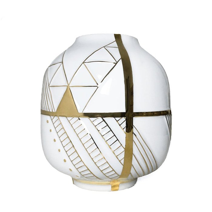 Vaso estilo cachepot alto, produzido em cerâmica com design inspirado em padrões indígenas, na cor branca e detalhes em dourado. Sua vontade de beleza expressa às tribos brasileiras, homenageiam com grande estima e sofisticação, por meio de inspiração, imaginação e técnica.