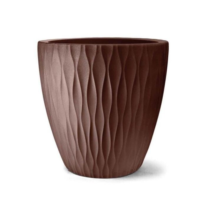 O Vaso Infinity Redondo da marca Nutriplan é produzido em polietileno na cor Tabaco, possui textura rústica, inspirada em barris de madeira.