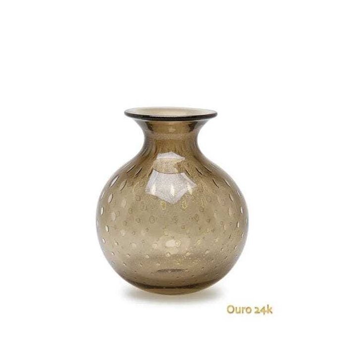 Vaso modelo Pérola Redondo com efeito de bolhas em vidro fumê leitoso com aplicação interna de Ouro 24K. O efeito dourado desta peça ocorre pela aplicação interna de Ouro 24k, que é inserido no processo de produção, quando a peça encontra-se a 800ºC. À aplicação de Ouro 24k, soma-se o efeito de bolhas simétricas que conferem elegância e nobreza à peça que disposta em conjuntos, ou mesmo solitária, atribui charme e requinte ao ambiente. Por ser uma peça artística e artesanal fabricada com as técnicas trazidas pela família Seguso da Ilha de Murano, em Veneza, podem ocorrer pequenas variações em suas características de cores e distribuição dos efeitos em relação à imagem.