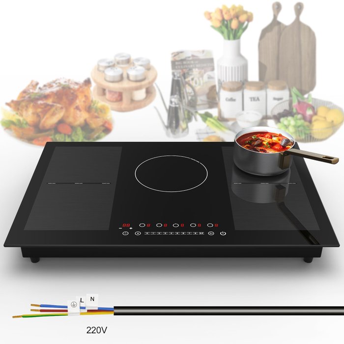 Instalação e Uso: Projetado para ser embutido, o cooktop precisa ser conectado diretamente à rede elétrica 220-240V (não acompanha plugue). As dimensões do produto são 20" x 34" x 3.3", proporcionando uma instalação simples e compatível com a maioria das cozinhas.