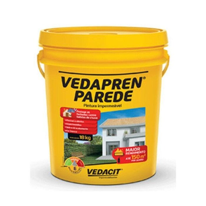 VEDAPREN PAREDE é uma pintura impermeável e elástica que protege as paredes contra fissuras e batidas de chuva, além de ter alta durabilidade. Pode ser aplicado sobre reboco, concreto, fibrocimento e tingido com corantes líquidos base água até o limite estabelecido pelo fabricante de corantes.