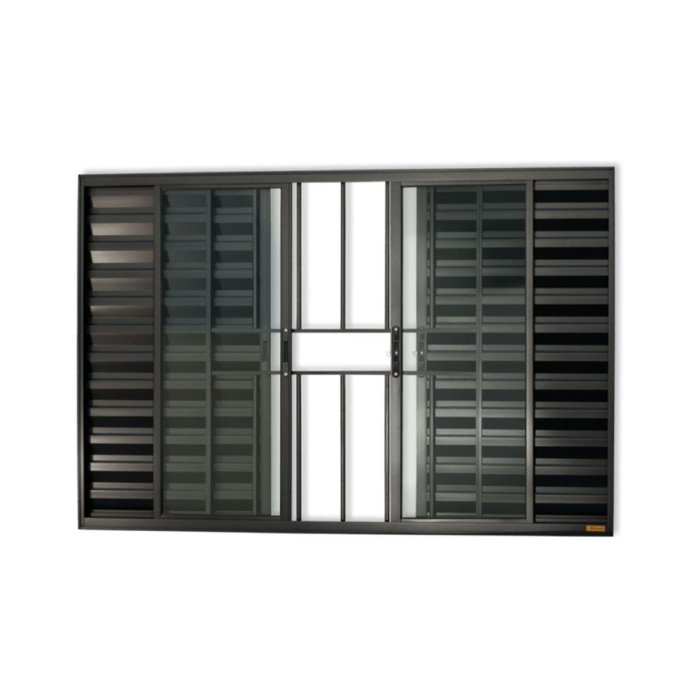 Venezianas 6 Folhas de Alumínio Linha Confort Pintura Eletrostática Preta Fecho embutido na cor do produto Escovas Vedadoras Hidrorrepelentes Vedação nos cantos 2 Folhas Fixas e 4 Folhas Móveis Vidro Liso Incolor 3mm Altura 100 Cm Largura 120 Cm Requadro 8 Cm Atende NBR10821 Garantia de 5 anos contra defeitos de fabricação