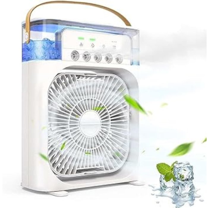 Somos a BK Utilidades líder em vendas no comércio do Brasil. Nossa principal missão é trazer a qualidade de nossos produtos, com um preço acessível e a confiança que você merece.-Ventilador Portátil de Mesa Mini Ar Condicionado Umidificador:Função de Temporização: Três opções de temporização automática (1H/2H/3H) para que você possa aproveitar seu tempo de lazer, sono ou trabalho da forma mais conveniente.Design Portátil: O design da alça torna o resfriador de ar evaporativo fácil de transportar para onde você quiser.Ajuste Vertical: Ajuste manualmente a direção do fluxo de ar em até 60 graus para criar sua própria zona de resfriamento pessoal.Reservatório de Água Removível: Facilita a limpeza do reservatório de água e permite adicionar cubos de gelo para um resfriamento adicional.LED de 7 Cores: Este mini ar-condicionado pessoal exibe 7 cores de LED que você pode escolher de acordo com sua preferência, incluindo um modo de transição de cores suave. Adicione mais diversão para sua casa! Também pode ser usado como uma luz noturna com uma luz suave que não irá atrapalhar o seu sono. Se você for sensível à luz, é possível desligá-lo.Ultra Silencioso e Eficiente em Energia: Nosso ventilador é silencioso, o que significa que não o incomodará enquanto trabalha ou dorme.Basta adicionar água ao reservatório para obter ar fresco. Este resfriador de ar é ecológico, eficiente em energia e tem baixo consumo. Seu reservatório pode conter até 600 ml de água e alguns cubos de gelo para uma renovação adicional do ambiente.Esse Ventilador Portátil de Mesa Mini Ar Condicionado Umidificador com reservatório de agua ou gelo permite refrigerar apenas o local onde a pessoa se encontra, mais mesmo assim dependendo do tamanho do ambiente, ele consegue umidificar e refrigerar ao mesmo tempo. Quando esta muito quente ele funciona de forma eficiente e sem barulho, e o mais importante com mínimo consumo de energia tendo em vista que seu funcionamento é por cabo USB, que permite que o aparelho seja muito econômico.Tendo em vista que é um aparelho de pequeno porte o uso ideal seria para apenas uma pessoa ou duas no máximo, pois o ventilador não tem a potencia dos ventiladores convencionais, o seu jato de nevoa pode ser usado em três intensidades diferente, as suas luzes de LED são mais notadas no escuro , pois são de luminosidade de baixa intensidade.O produto ainda possui um temporizador, que pode ser usado de forma mais eficiente usando um time de 2,5 e 12 horas de usos continuo, lembrando que pode ser usado gelo ao invés de agua, para que o ar fique mais gelado. Use apenas agua limpa para que os filtros da nevoa não fiquem entupidos, sempre que usar o climatizador com agua , antes de guardar despeje toda a agua e limpe com um paninho ou papel higiênico , para que as peças eletrônicas não oxidem de forma rápida com o tempo.CARACTERÍSTICAS DO CLIMATIZADOR:- Cria uma zona de resfriamento em 8 m².- Vento de intensidade moderada.- Escolha entre 3 velocidades e ajuste o fluxo de ar.- Basta adicionar água gelada ou gelo.- Não foi projetado para esfriar uma sala inteira.- O produto não é totalmente impermeável, é proibido molhar ou despejar agua em cima dele.- A corrente de saída de energia tem que ser igual ou maior que 2A.- Se ligado ao computador ou notebook o fornecimento de energia para o aparelho é insuficiente.ESPECIFICAÇÕES:- Potência: 10w.- Capacidade do tanque de água: 600 ml.- Tamanho: 26 cm x 21 cm x 9 cm.- Ventos velocidade: 3 modos (Alto/Médio/Baixo).- Ruído: Em menos de 42dB (A).- O Tempo de pulverização: Até 12 horas.- Tensão:5V-2A.- Peso: 726g(sem agua).AVISO IMPORTANTE:- 1. Não incline quando estiver ligado, pode derramar a agua do reservatório.- 2. Adicione a água limpa, para evitar que afete função de pulverização.- 3. A adição de 3/4 de Água no Tanque deixa o aparelho com um funcionamento mais rápido.O PACOTE INCLUI:- 1 x Refrigerador climatizador.- 1 x Cabo USB.- 1 x Manual