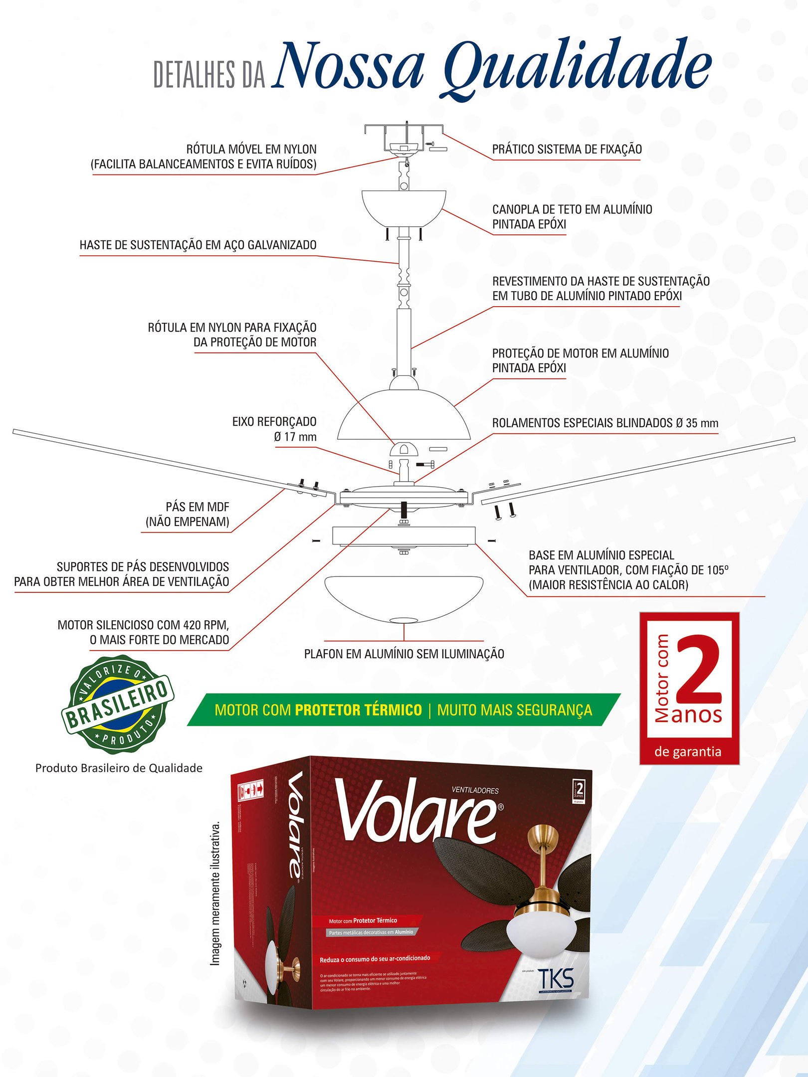 | Itens Inclusos | 1 Ventilador de teto, 1 Chave de parede e Manual de instruções. |