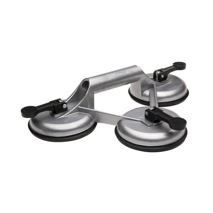 Ventosa tripla; possui corpo de alumínio fundido; pintura eletrostática a pó; ventosas de borracha com sistema de aspiração; trava de segurança; capacidade máxima de carga: 30 kg por ventosa; ideal para o manuseio das chapas, vidros, portas e quaisquer objetos que possuam a superfície lisa e plana para que a ventosa seja fixada.