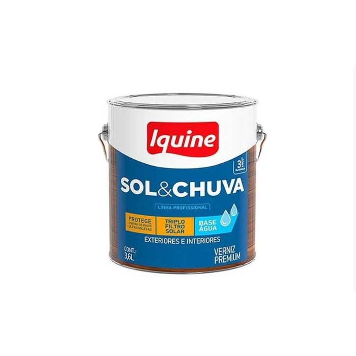 Verniz Sol e Chuva Base Água é a base de polímero acrílico em emulsão com triplo filtro solar, que protege e realça a superfície da madeira. Sua formulação exclusiva proporciona, à película, proteção contra água, fungos e intemperismo
