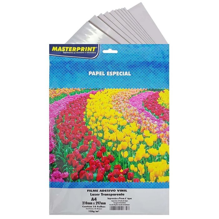 Vinil Adesivo Laser Transparente Brilhante A4 135g À Prova D'Água Filme Glossy p/ Impressora Laser 10 Folhas Masterprint
