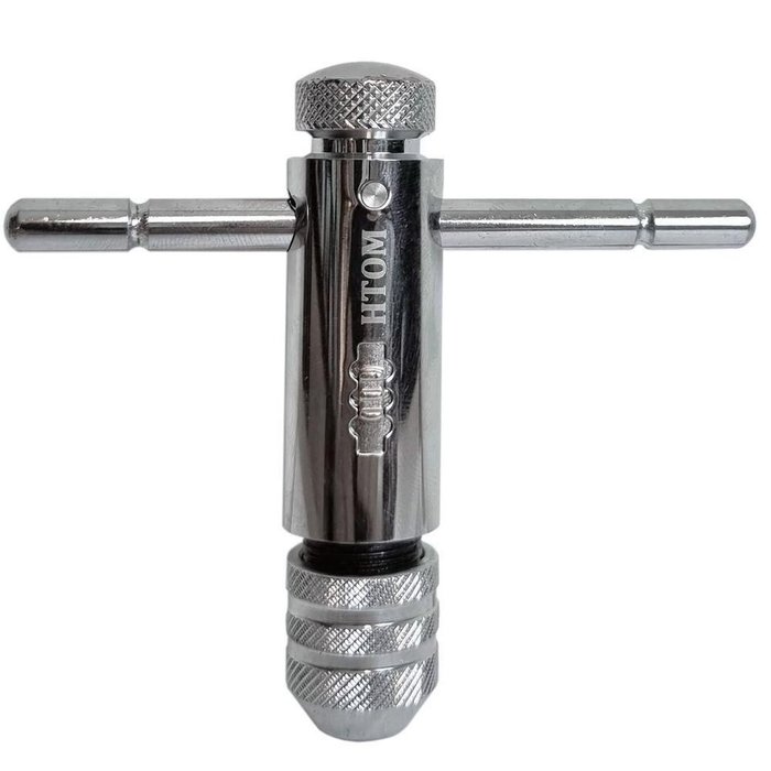 Vira Macho C/ Catraca Tipo T 1/8 a 3/8 Pol M3 a M10 VMT-1L - HTOM O Vira Macho C/ Catraca Tipo T HTOM é uma ferramenta manual de alta precisão e resistência, projetada para segurar e girar machos durante o processo de corte de roscas internas em metais. Equipado com uma catraca para facilitar o movimento, sua construção robusta e ergonômica permite um manuseio seguro e eficiente, tornando-o ideal para uso em manutenção industrial, mecânica e outras aplicações que exigem roscas internas de alta qualidade. Para utilizar o Vira Macho C/ Catraca Tipo T, fixe firmemente o macho na ferramenta, garantindo que esteja bem ajustado. Alinhe o macho com o furo a ser rosqueado e comece a girar a ferramenta no sentido horário, aplicando pressão uniforme até formar a rosca desejada. Inverta a rotação periodicamente para remover as aparas de metal. Após o uso, limpe a ferramenta e o macho para remover resíduos de óleo e metal. ESPECIFICAÇÕES TÉCNICAS DO VIRA MACHO C/ CATRACA TIPO T Faixa de Aperto: 1/8 a 3/8 Pol (M3 a M10)
