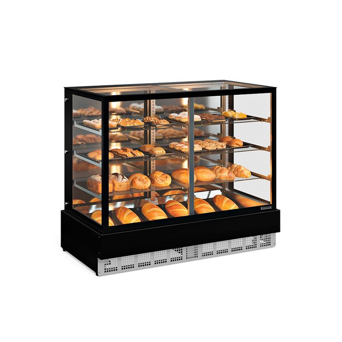 a Vitrine possui 3 níveis de prateleiras em vidro temperado reguláveis, o que permite conforto e atende a necessidade de seu usuário para que adeque as prateleiras de acordo com sua demanda, seu fundo é inclinado especialmente para bandejas de pães, suas portas são confeccionadas em aço inox internamente e externamente em aço pintado em preto, sendo deslizantes e com corrediça, facilitando a sua abertura.