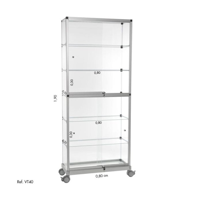 Vitrine Torre Modulado em vidro temperado de 4mm com bordas tratadas, perfil de alumínio e rodízios duplo (carga de 60 kg) com quatro portas deslizantes em vidro 6mm com fechaduras, puxadores e guarda pó. Ideal para lojas ou magazines para produtos de maior valor como joias, relógios, bebidas importadas e etc.