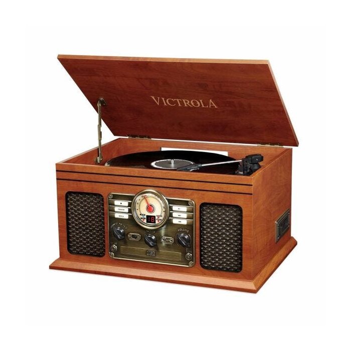 Centro de entretenimento nostálgico Bluetooth 6-em-1. Este lindo toca-discos nostálgico de madeira Victrola possui 6 maneiras de tocar sua música. Carregado com recursos, incluindo; Mesa giratória de 3 velocidades (33 1/3, 45, 78 RPM). Leitor de CDs, leitor de cassetes, Bluetooth incorporado para reproduzir música sem fios a partir do seu dispositivo com Bluetooth, rádio FM, entrada auxiliar de 3,5 mm para reproduzir música de qualquer dispositivo não Bluetooth (cabo incluído), tomada de auscultadores e RCA Aux. no jack.