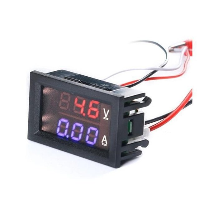 O produto é um voltímetro amperímetro de alta qualidade. Mede tensão até 100V e corrente até 10A. Características: Cor do display: azul (voltagem), vermelho (amperagem) Instalação de embutir Display LED de alto desempenho Não necessita de shunt externo, já está embutido no aparelho Ligação: Depende do lote podem existir dois tipos de fiação: Fio Amarelo/Preto/Vermelho fino com Preto/Vermelho grosso: Medição menor que 4.5V ou maior que 30V DC Cabos finos: Vermelho - Positivo da fonte externa entre 4 e 30V DC Preto - Negativo da fonte externa entre 4 e 30V DC Amarelo - Positivo entre o aparelho que está sendo medido e a fonte de energia Cabos grossos: Preto - Entrada Negativo da fonte de energia até o medidor Vermelho - Saída Negativo do medidor até o aparelho Medição entre 4.5V e 30V DC Cabos finos: Vermelho - Positivo da fonte de alimentação Preto - Desconectado e isolado Amarelo - Positivo da fonte de alimentação Cabos grossos: Preto - Entrada Negativo da fonte até o medidor Vermelho - Saída Negativo do medidor até o aparelho Fio Vermelho/Preto/Azul grosso com Preto/Vermelho fino: Medição menor que 4.5V ou maior que 30V DC Cabos finos: Vermelho - Positivo da fonte externa entre 4 e 30V DC Preto - Negativo da fonte externa entre 4 e 30V DC Cabos grossos: Vermelho: Positivo entre o aparelho que está sendo medido e a fonte de energia Preto: Entrada Negativo da fonte de energia até o medidor Azul: Saída Negativo do medidor até o aparelho Medição entre 4.5V e 30V DC Cabos finos: Vermelho - Positivo da fonte de energia (ligar junto com Vermelho grosso) Preto - Negativo da fonte de energia (ligar junto com Preto grosso) Cabos grossos: Vermelho: Positivo entre o aparelho que está sendo medido e a fonte de energia Preto: Entrada Negativo da fonte de energia até o medidor Azul: Saída Negativo do medidor até o aparelho Especificações técnicas: Tensão de alimentação: 4.5-30V DC Tensão de medição: 0 - 100V DC Corrente de medição: 0 - 10A DC Precisão de medição: 0.01A / 0.1V Corrente de funcionamento: