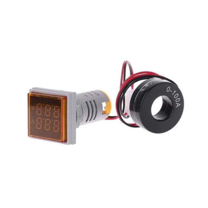Voltimetro e Amperímetro Quadrado 22 mm AC 60-500V 100A - Amarelo
