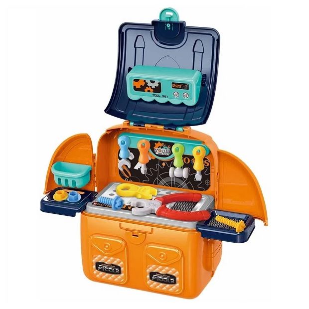 Acompanha mais de 20 acessórios temáticos para brincar de ser um(a) construtor(a) de verdade: ferramentas, parafusos, serrote, alicate de brincadeirinha e muito mais!