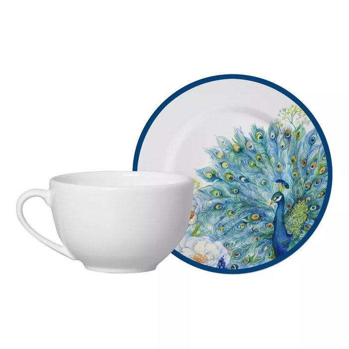 Linda xicara de chá com pires de cerâmica com estampa de pavão! Perfeito para adicionar um toque de elegância à sua mesa.