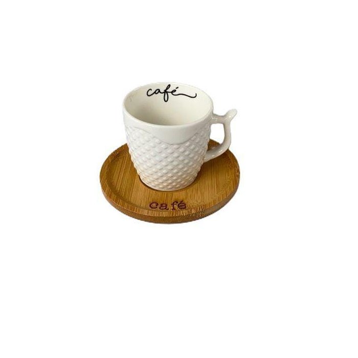 Xícara de Café em Porcelana com Pires de Bambu 70Ml Estampado Café
