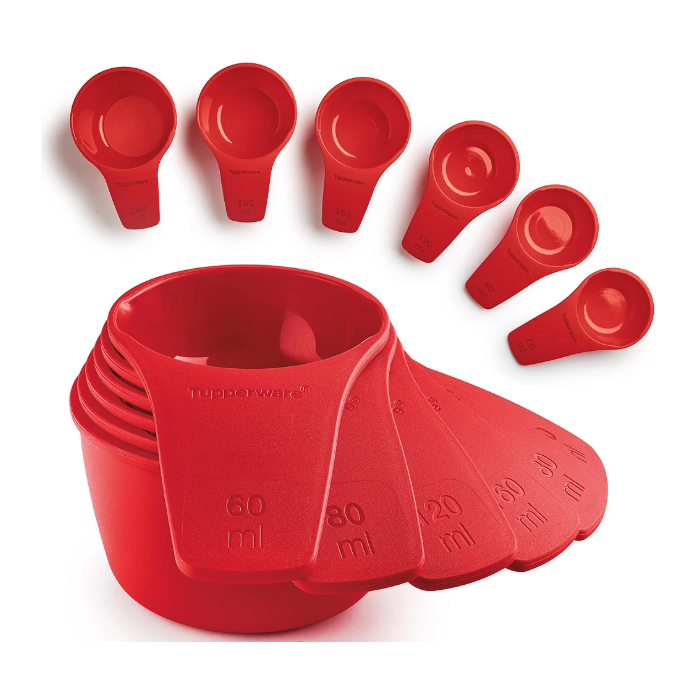 As Xícaras Medidoras Geração II da Tupperware são aquelas ajudantes indispensáveis na hora de cozinhar com precisão. Seja pra acertar nas receitas de família ou testar algo novo, esse conjunto completo vai facilitar sua vida! São 6 peças com medidas diferentes — de 60ml a 240ml — todas empilháveis, com cabo anatômico e num tom vermelho apaixonante que alegra qualquer cozinha