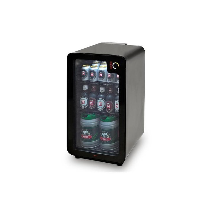 Uma cervejeira preta com capacidade de 100 litros da marca Memo.