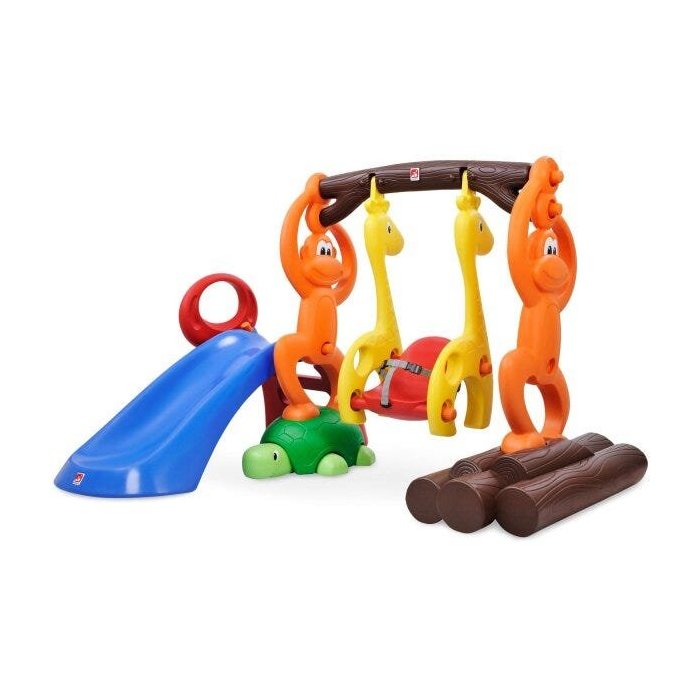Miniparque de diversões para estimular a atividade física das crianças. Estrutura toda em plástico, pode ser utilizado em áreas internas. Composto de balanço com cinto de segurança, escorregador, degraus com textura antiderrapante, figuras de animais em alto-relevo. Indicado para maiores de 24 meses.