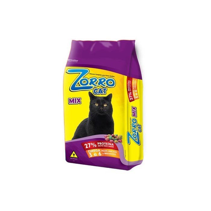 Zorro Cat Mix 25,kg Milho integral moído, arroz quebrado, farelo de trigo, farelo de soja, farelo de arroz, farelo de glúten de milho ? 60, farelo de glúten de milho ? 21, farinha de vísceras, farinha de carne e ossos, gordura de frango, aditivo palatabilizante líquido (hidrolisado) de fígado de suínos, vísceras e fígado de frango, cloreto de sódio (sal comum), aditivos corantes (amarelo tartrazina, azul brilhante, vermelho allura), sulfato ferroso, sulfato de cobre pentahidratado, sulfato de manganês, óxido de zinco, sulfato de cobalto, iodato de cálcio, selenito de sódio, vitamina A, vitamina D3, vitamina E, vitamina K3, vitamina B1, vitamina B2, vitamina B6, vitamina B12, Ácido fólico, ácido nicotínico, ácido pantotênico, biotina, taurina, aditivo antioxidante (B.H.T./B.H.A.).